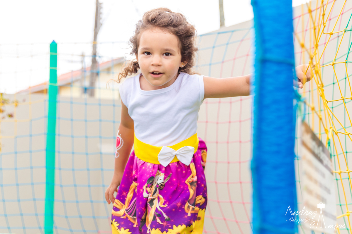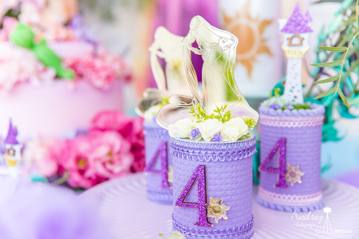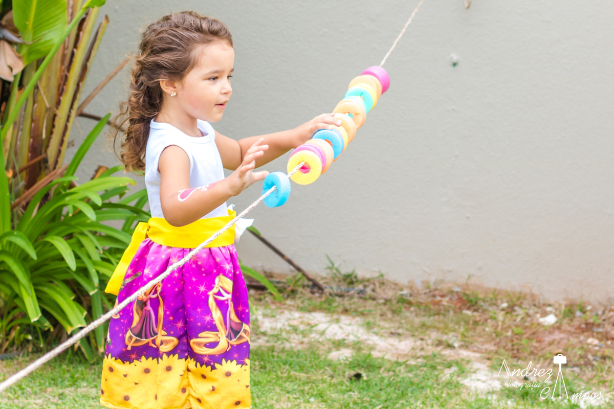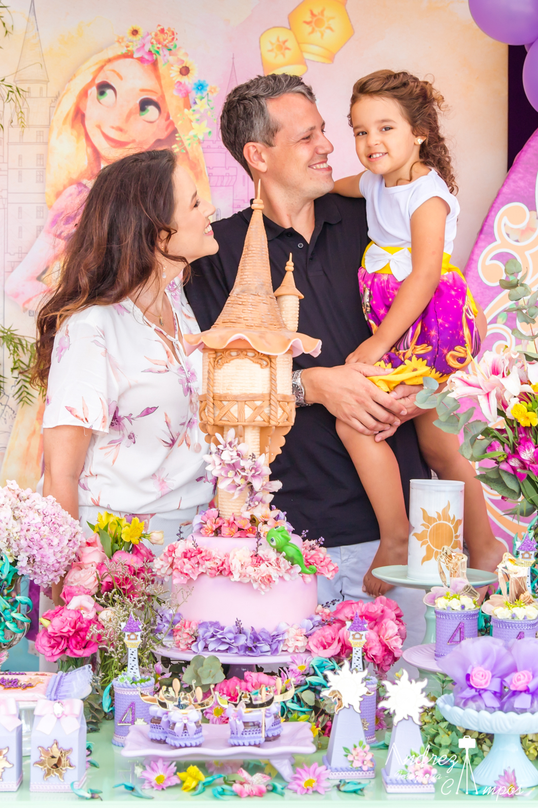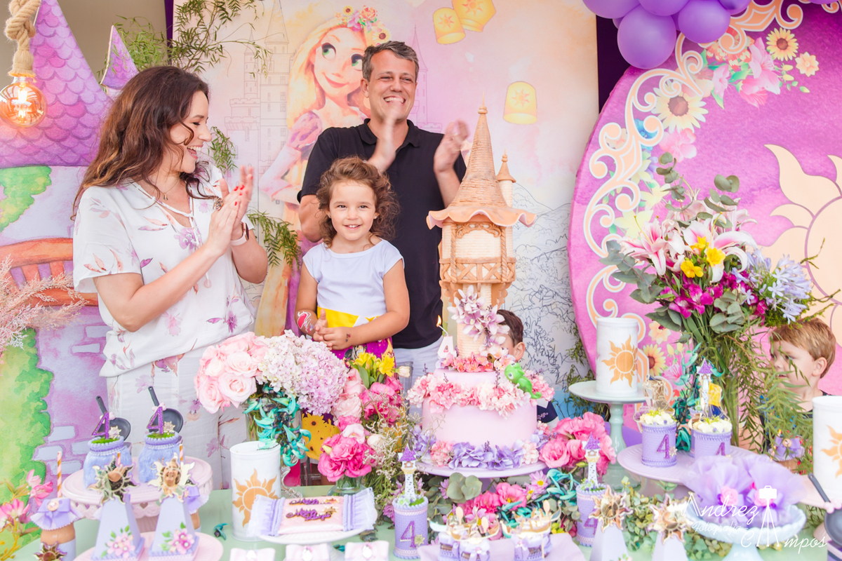 O tema escolhido para a comemoração da festa de aniversário foi Enrolados, a famosa Rapunzel e a aniversariante estava toda linda, com roupa personalizada combinando com o tema da festa e tudo.